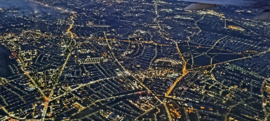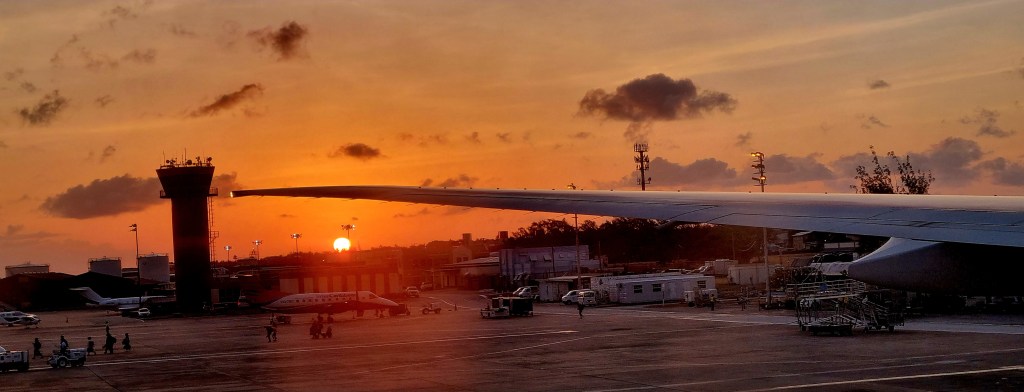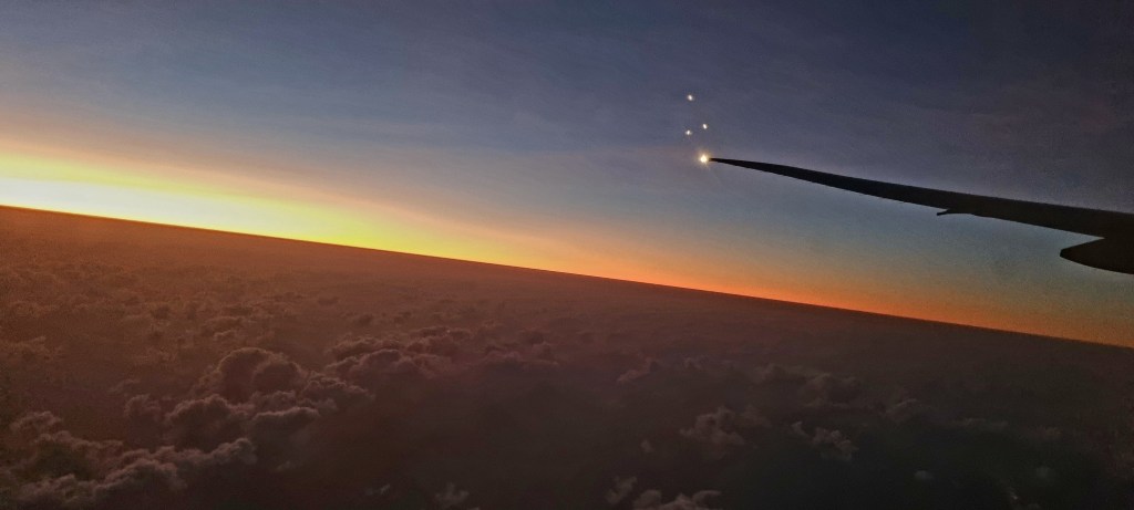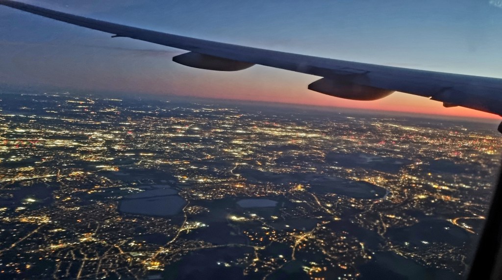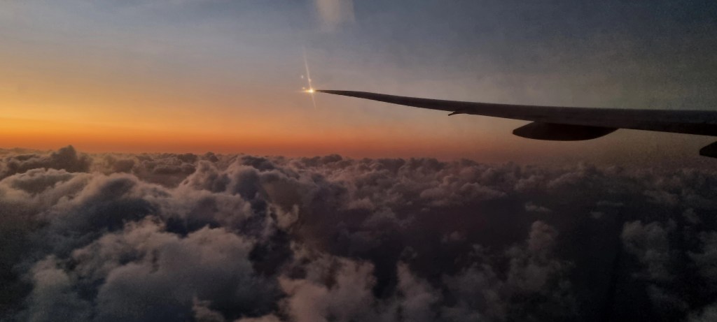 The flight was delayed by around 30 minutes, and we left just as the sun was setting.