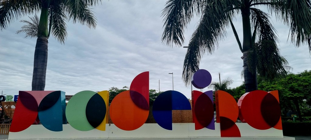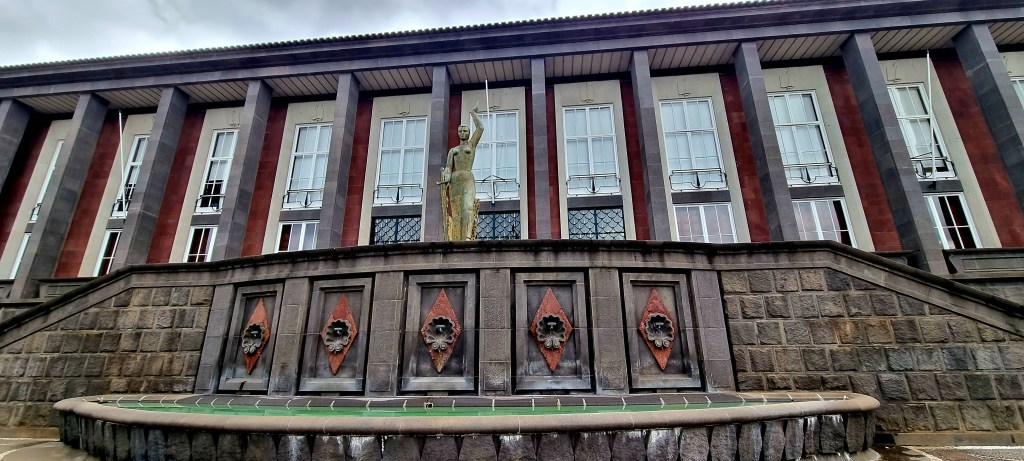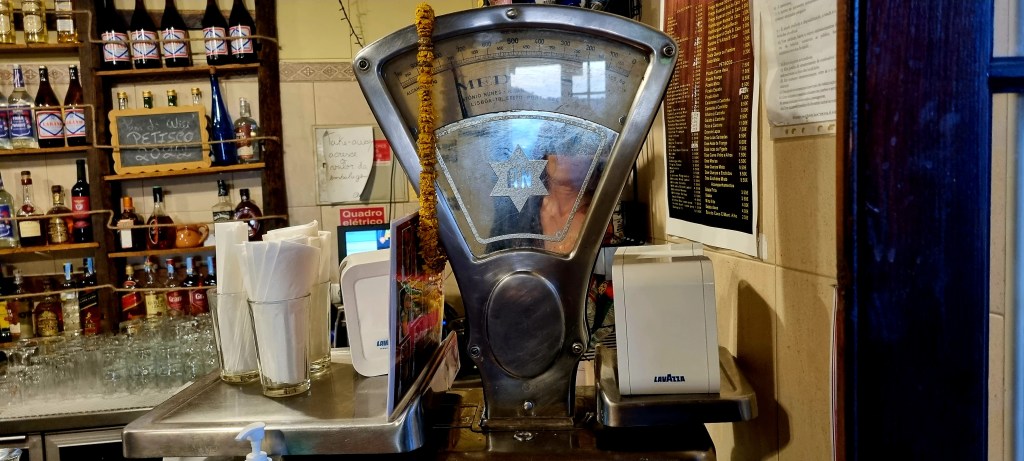In the evening we got the bus into town and went to the Espaco restaurant. On the way, we walked past the ‘old gate’. This is a reconstruction of the city’s old wall gate. It was built in 1689 but demolished in 1911 when the city was reconstructed to allow traffic through. It was reconstructed in 2004 and contains some of the original elements, such as the crown, the royal arms, and the inscribed stone.