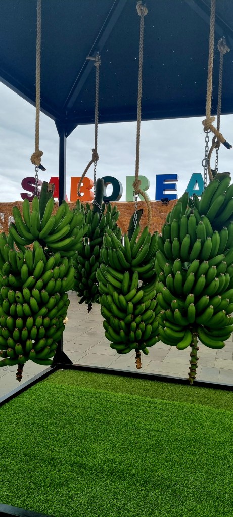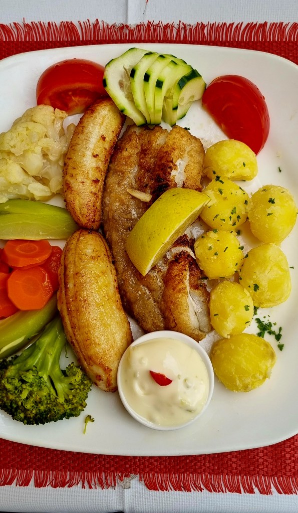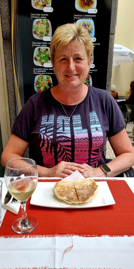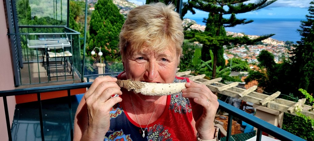 We wandered around for a bit before deciding on somewhere to eat. There was a lot of choice, but we decided on a place because the waitress was very friendly. We had the local garlic bread (Bolo) to start and scabbard fish and bananas as the main.