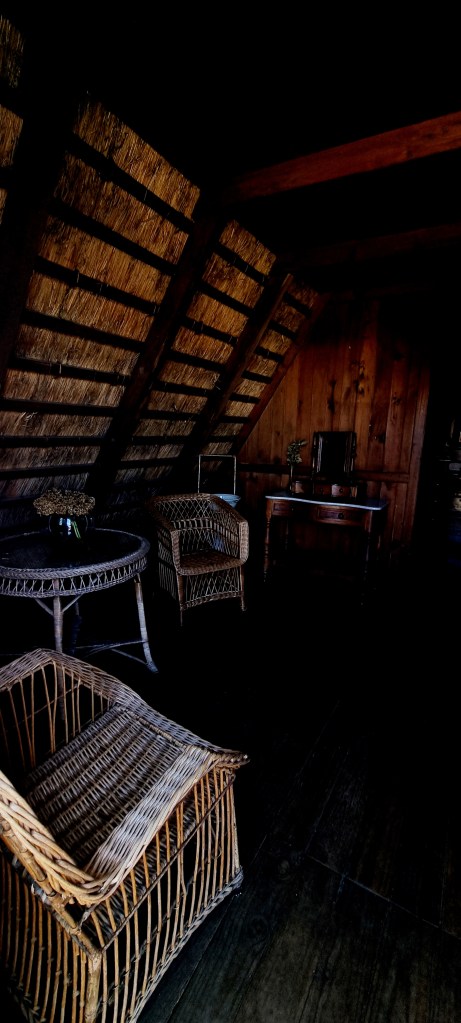 In the study we saw the ‘Gentleman’s Chair’. In 1936, this was considered the ultimate in relaxation as it has adjustable tables, book holder, reading lamp, backrest and footrest. It can also be wheeledfrim one room to another. This particular chair was made in England in the 1830s.